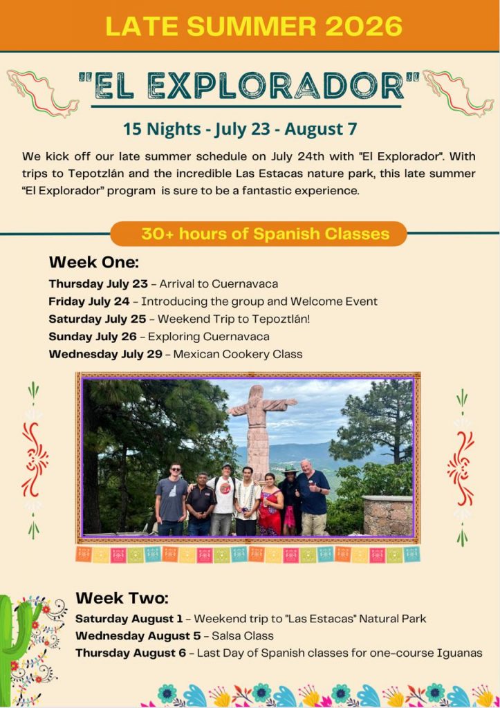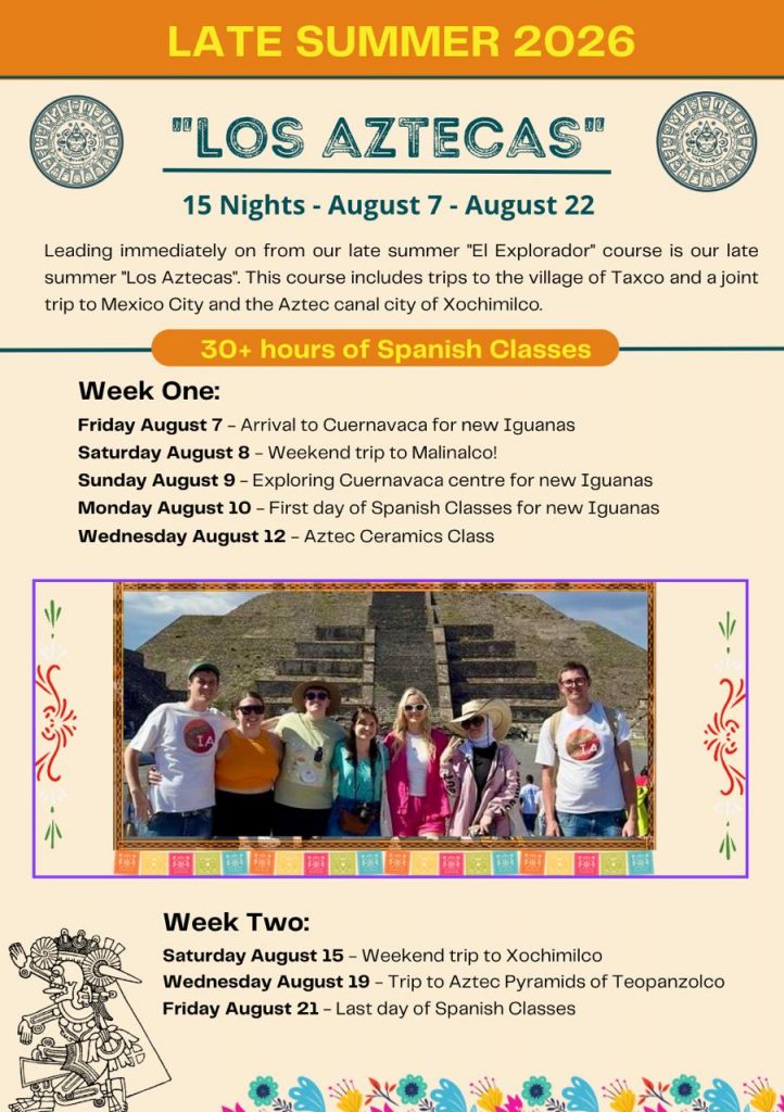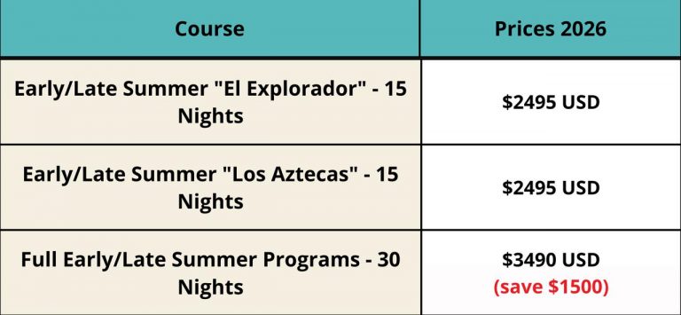 Take Advantage of our Special Offer for the 2026 Season! Our 15-Night programs are priced at $2495 USD all inclusive, but our full 30-Night courses are priced at $3490 (“El Explorador” plus “Los Aztecas”, Full Early Summer or Full Late Summer) – so if you decide to do the full 30-Night program, you will save a huge $1500 USD on the overall course price!