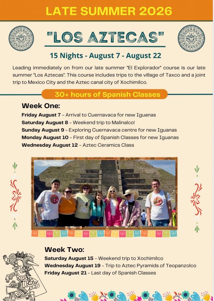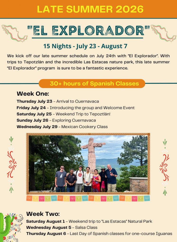 Take Advantage of our Special Offer for the 2026 Season! Our 15-Night programs are priced at $2495 USD all inclusive, but our full 30-Night courses are priced at $3490 (“El Explorador” plus “Los Aztecas”, Full Early Summer or Full Late Summer) – so if you decide to do the full 30-Night program, you will save $1500 USD on the overall course price!